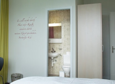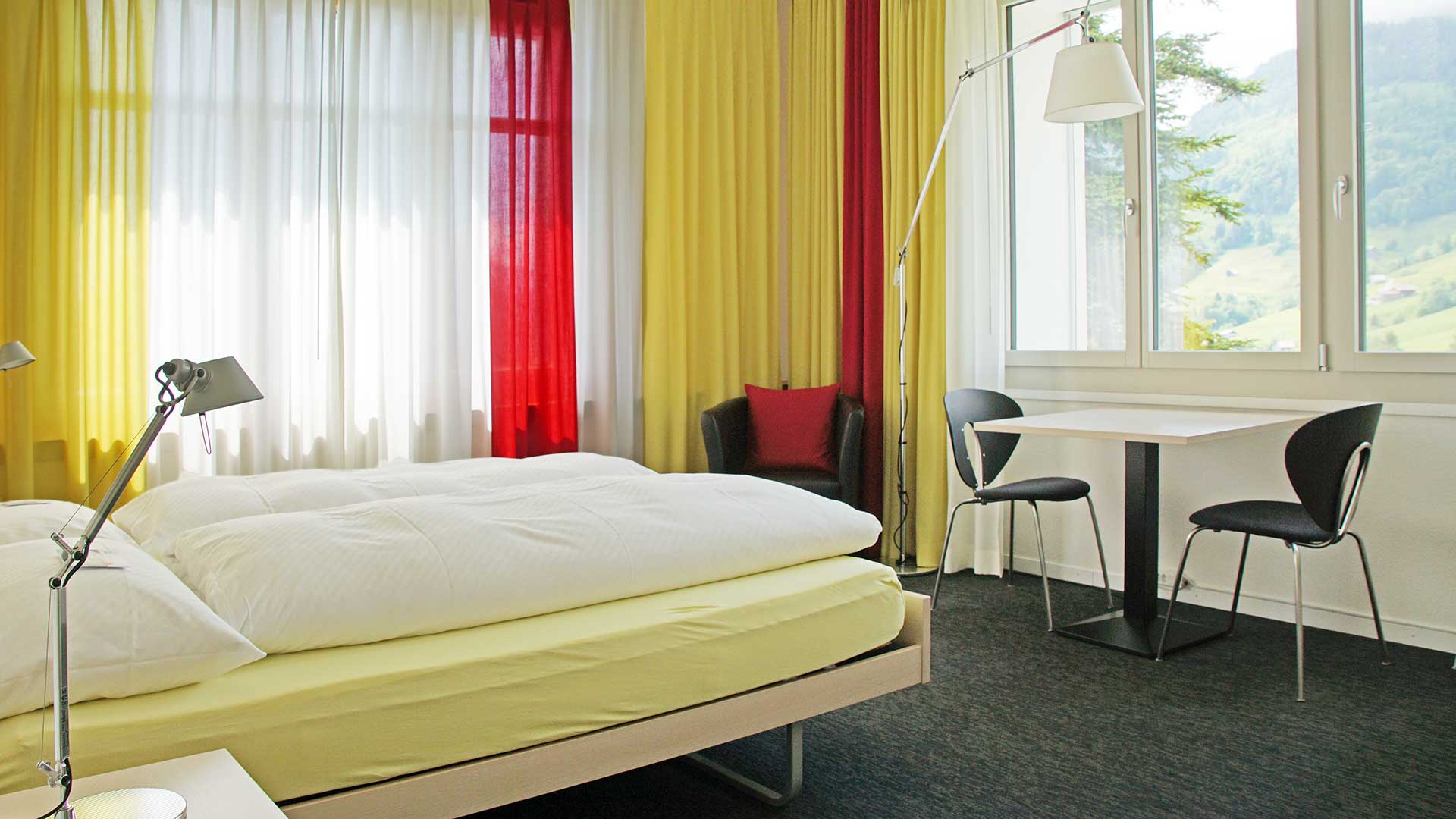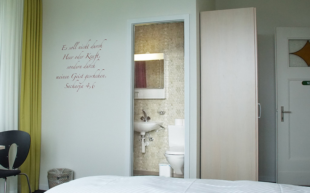 Grosszügige und helle Doppel- oder Zweibettzimmer mit Südsicht und eigenem Badezimmer mit Dusche.